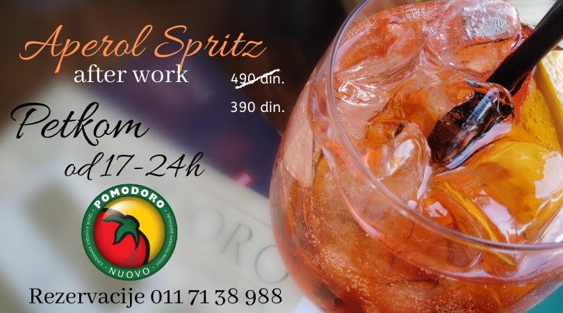 Iako smo već zašli u duboku jesen, to se ne bi reklo ni po temperaturi ni po atmosferi u restoranu Pomodoro Nuovo: kraj nedelje se ovde može dočekati uz čuveni koktel Aperol Spritz, koji podseća na mirise i ukuse leta, i ukusno iznenađenje po ceni od 390 dinara, na afterwork događaju ovog petka od 17 do 24h.