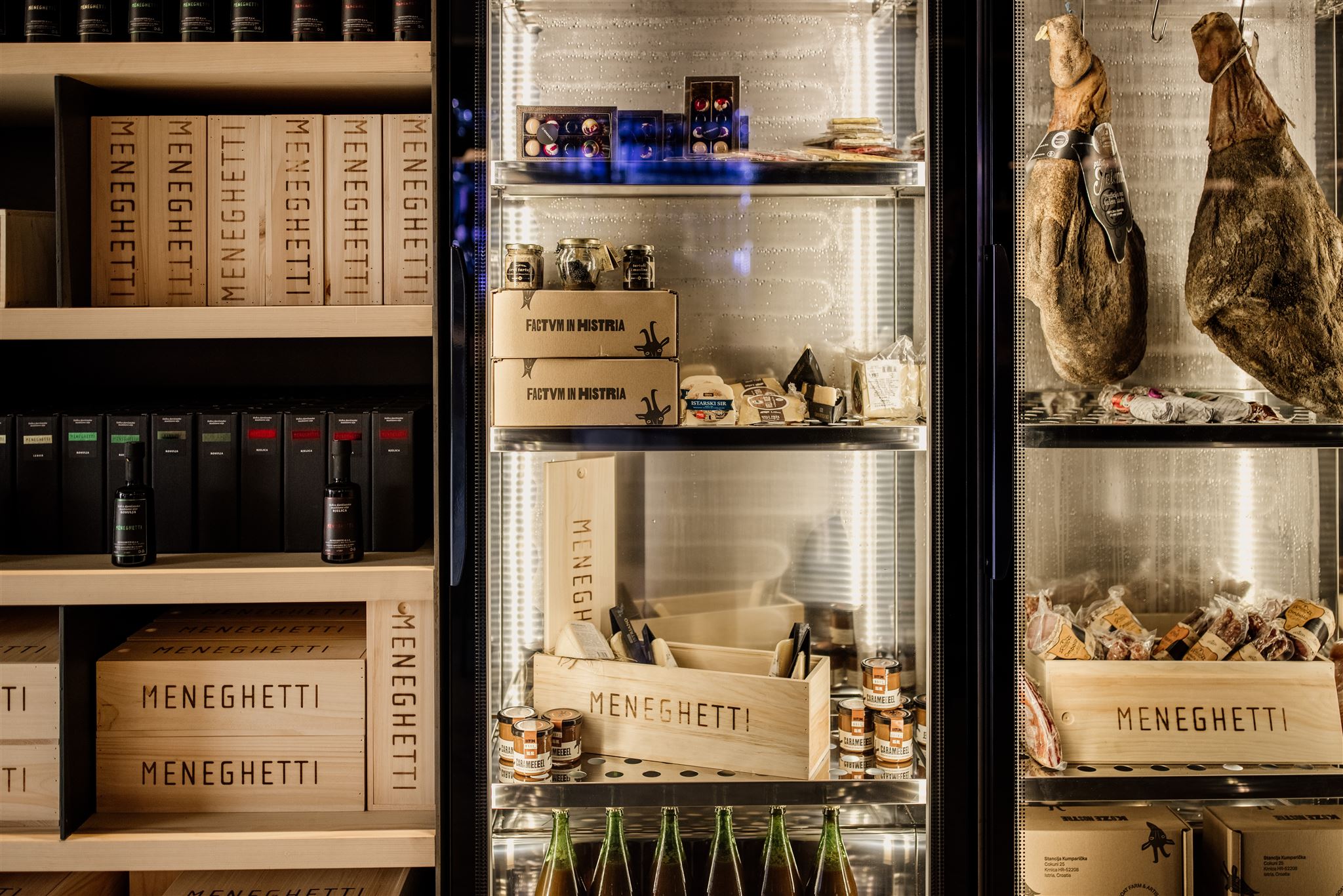 U Meneghetti Butigi (gift shopu) prodaju se birani delikatesi kao što su birani sirevi, domaće kobasice, pršute, ali i jedinstveni proizvodi - karamela od kozjeg sira Kumparička ili aromatizovan cvet soli infuziran u vinu Meneghetti Red, kao i ručno rađene praline.
