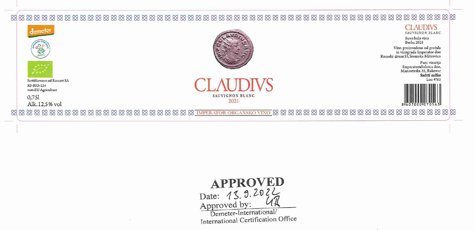 Vino Claudivs 201 kuće Imperator dobio je potvrdu sertifikacionog tela Demeter da su u njegovoj proizvodnji dosledno primenjene biodinamičke prakse