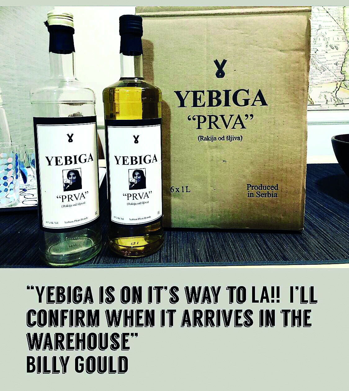 Sve je počelo kao serija kriptičnih objava na društvenim mrežama - jedna reč, Yebiga, jedna morbidna etiketa sa crnim florom i fotografijom starice koja pije rakiju, i dubiozna tvrdnja da Bili Guld, basista grupe Faith No More, i, kako vole da pišu masovni mediji, "prijatelj Srbije", u svoj kreativni i poslovni portfolio upravo upisuje i promovisanje srpske rakije. Čak i za one koji prate nesvakidašnju ljubav Srbije i članova ovog benda, ova tvrdnja izgledala je kao plod tabloidske mitomanije, sve dok stvar nije postala sasvim zvanična: da, Bili Guld odlučio je da ljubav prema srpskoj žestini ovaploti kroz ambiciozan projekat navikavanja Amerikanaca na mrštenje tokom ispijanja naše "mučenice". Rakija Yebiga, koja se na istoimenoj veb stranici promoviše pod motom "Balkanski protivotrov za lažne vesti", može se kupiti u nekoliko prodavnica alkoholnih pića u Kaliforniji, kao i u odabranim barovima u San Francisku i Los Anđelesu, a na samom sajtu možete kupiti, za dvadeset dolara, majicu sa neobičnim logom ovog, za nas, sasvim običnog pića koje se sada prvi put otisnulo na drugu stranu Atlantika.