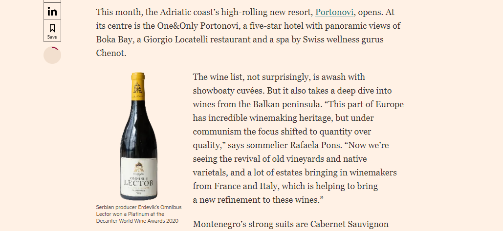 - Srpski vinski specijalitet, prokupac, ovde se može naći u etiketi Credo, crvenoj kupaži vinarije Virtus. Ali, srpsko vino koje se u najvećoj meri ističe je Omnibus Lector, stopostotni šardone nalik na one iz Mersoa, a koji je napravila dinamična dunavska vinska kuća Erdevik. Ovo intenzivno i sveže vino osvojilo je prestižnu platinastu medalju na Dekanterovom takmičenju 2020 – navodi se u Fajnenšel tajmsu u kome su pohvaljeni i Vranac rezerva 2016 crnogorske vinarije Sjekloća, kao i jedna bordovska kupaža istarske kuće Meneghetti. Pomenuta je mogućnost da gosti resorta Portonovi uživaju u degustaciji vina u obližnjoj vinariji Savina.