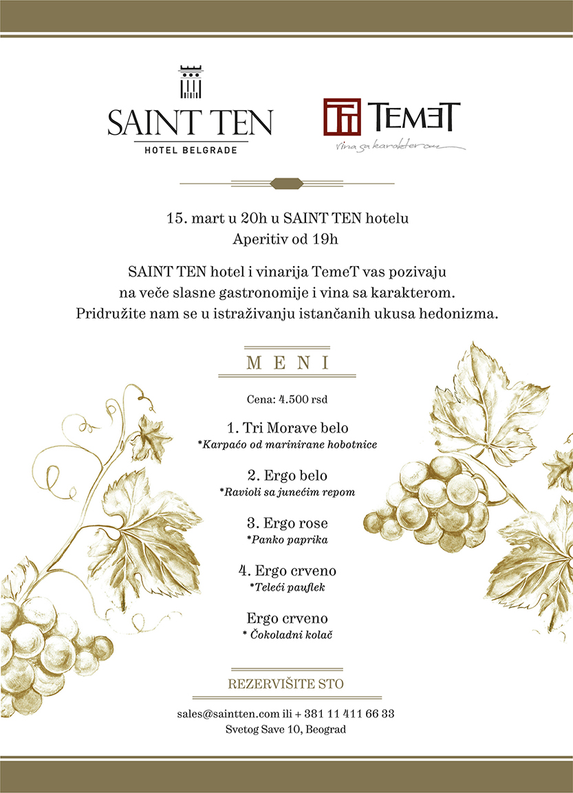 Da je večera uz vino mnogo više od obroka, uverite se 15. marta u SAINT TEN hotelu. Od 20h vinarija Temet i Saint Ten hotel pozivaju sve gurmane i ljubitelje dobrog vina na posebno vinsko veče.