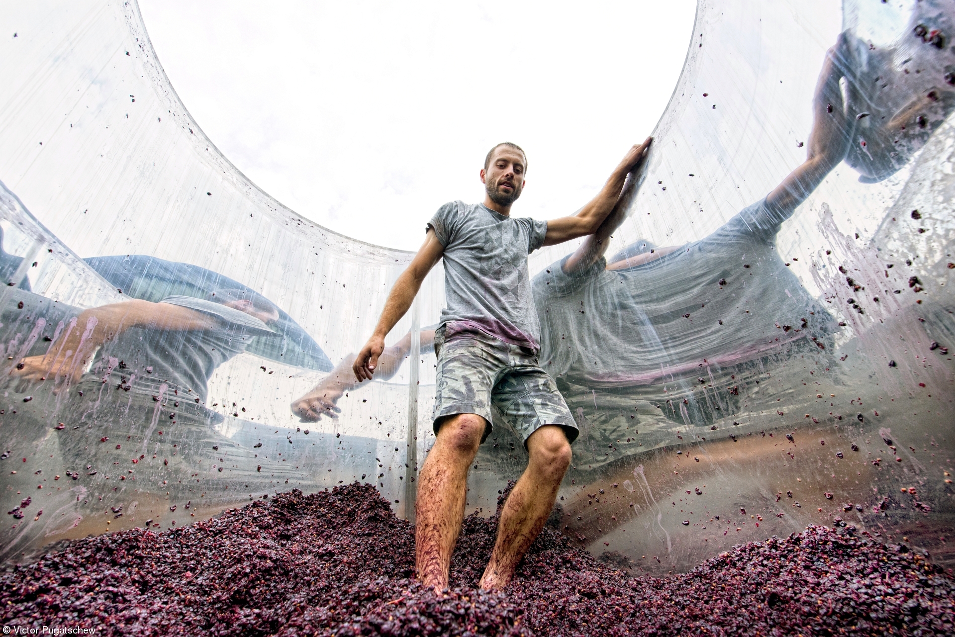 U kategoriji Vino - Ljudi pobedila je fotografija Gnječenje pino noara australijskog fotografa Viktora Pugačeva. Oštri kontrasti i kompozicija kojom je oneobičen ovaj drevni postupak dobijanja vinskog mošta - lik radnika u vinariji kao da pleše sa svojim odrazima u metalnim zidovima rezervoara za grožđe - odišu dinamikom i jednostavnom lepotom zabeleženom u vinogradu Hadls Krik u Australiji.