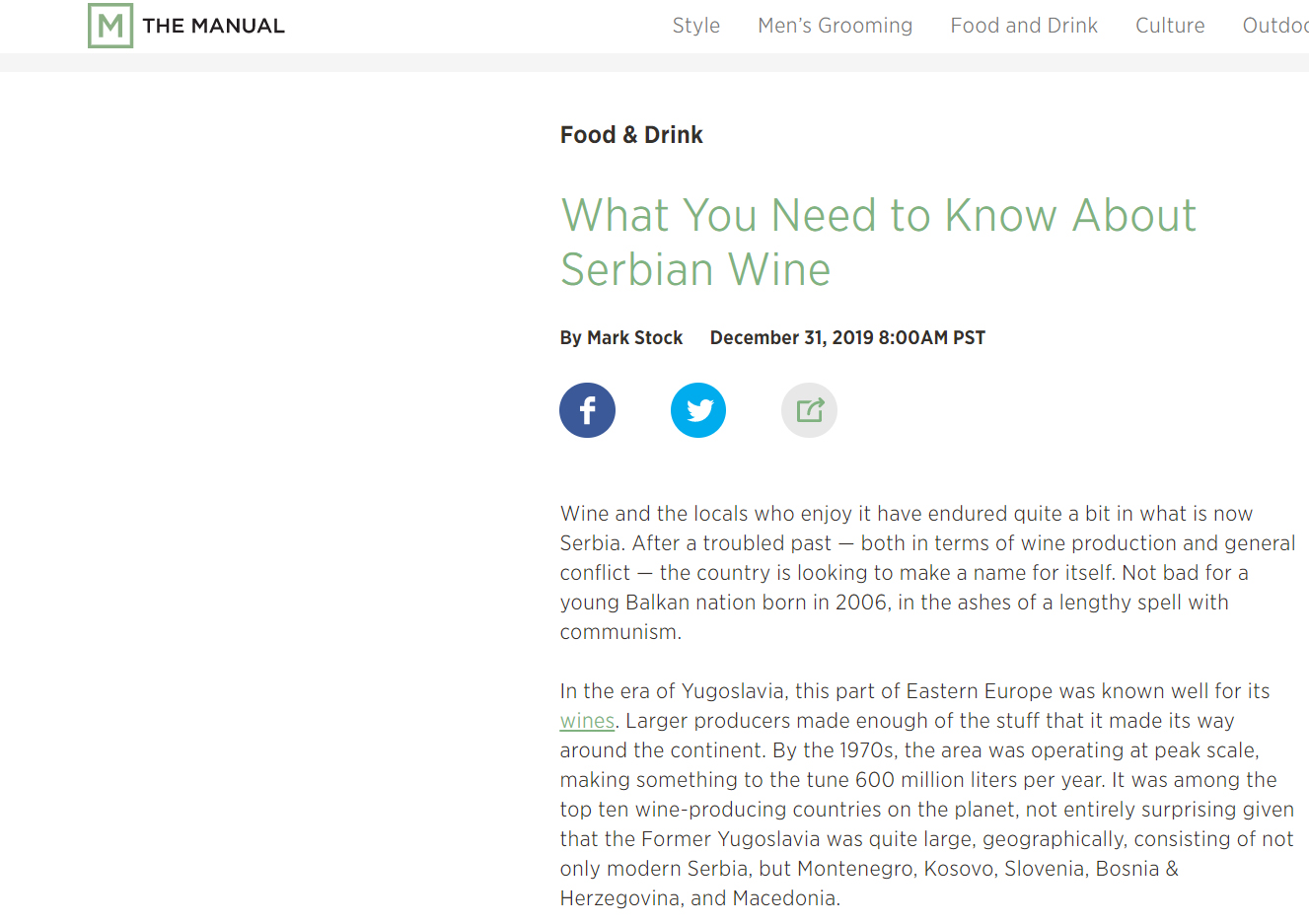 Vina iz Srbije dobila su lepe komplimente na vrlo čitanom američkom sajtu The Manual, namenjenom pre svega muškarcima koji tragaju za novim hedonističkim iskustvima. Autor Mark Stok napisao je tekst po imenu What You Need to Know About Serbian Wine u kome je na vrlo informisan i dobronameran način, ne pateći od zamke stavljanja Srbije u uzanu nišu egzotičnih zemalja iz koje dolaze isto takva vina, predstavio u nekoliko pasusa osnove srpskog vinarstva.