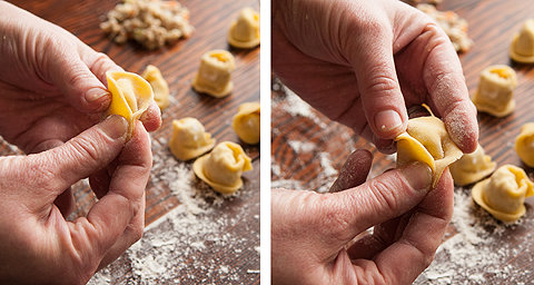 3. Loptu od testa oklagijom razviti u krug debljine jednog santimetra i nožem iseći na trake širine takođe jednog santimetra. Trake testa zatim ubaciti u mašinu za razvijanje (podesite na njoj debljinu testa na 5), posuti radnu površinu brašnom i dobijene trake od testa položiti na radnu površinu. Iseckati testo iz mašine na kvadratiće dimenzija 4 x 4 cm. Punjenje staviti na sredinu, preklopiti u trougao, lagano prstima istisnuti vazduh, spojiti krajeve trougla u specifičan oblik cappelletta ili ti šeširića.