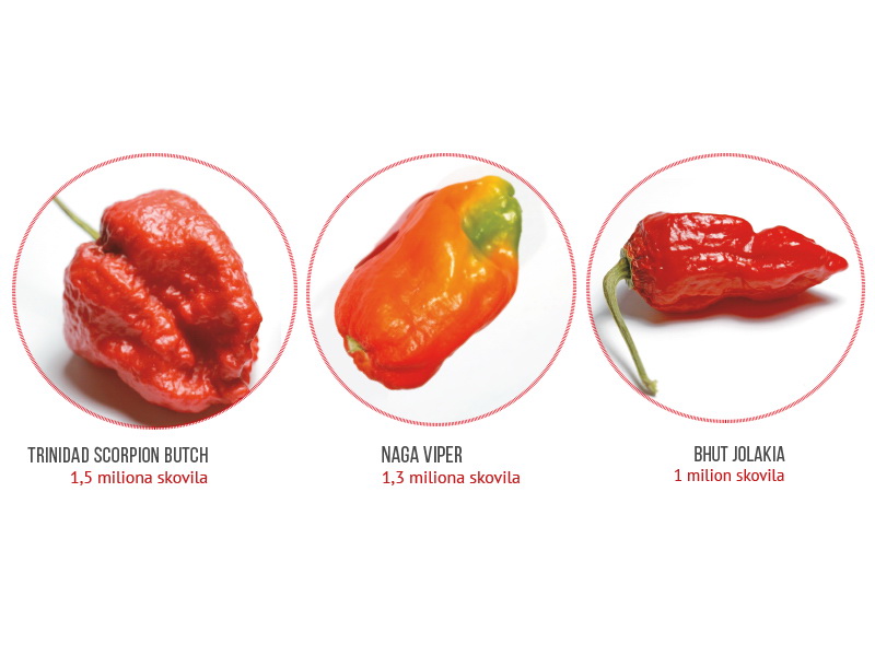 Kao i o mnogo čemu drugom, tako su i mišljenja o tome koja je paprika najljuća na svetu duboko podeljena, čemu u prilog idu i stalne promene situacije, jer se neprestano radi na mutiranju i genetskom inženjeringu sve ljućih i ljućih primeraka. Papričica „Trinidad Scorpion Moruga“ je na ispitivanjima dostigla do sada najvišu zabeleženu vrednost od neverovatnih 2.009.231 SHU, ali joj tron do danas nije priznat jer, uprkos tome što joj je najviša izmerena vrednost fascinantna, prosečna nije prelazila 1,2 miliona SHU. U nedostatku boljeg rešenja, držaćemo se Ginisove knjige rekorda, gde su se vodili srednjim izmerenim vrednostima i tako poređali pet veličanstvenih. Zvanično najljuća je australijska „Trinidad Scorpion Butch“ s prosečnom ljutinom od 1.463.700 SHU, a druga „Naga Viper“, hibrid tri postojeće paprike koji je dostigao 1.382.118 SHU u proseku. Na trećem mestu je „Infinity Chilli“ ili „Infinity 7 Pot“ sa 1.067.286 SHU, a danas se tek na četvrtom nalazi čuvena „Bhut Jolokia“, verovatno najpoznatija ljuta papričica na svetu koja je na engleskom govornom području poznata i kao „Ghost pepper“. Uzgojena u Novom Meksiku, punih šest godina je „Bhut Jolokia“ suvereno vladala kao ubedljivo najljuća na svetu s tada nepojmljivih 1.001.304 SHU ljutine i postala planetarno popularni Sveti gral za najhrabrije ili najluđe; procenite sami. U našim krajevima je pravu slavu stekla kada je se dočepao izvesni konobar Stanko Đurić, koji ju je pojeo pred kamerom i desetominutni klip njegove verzije Tantalovih muka je u trenu postao hit na internetu. Ako kojim slučajem niste gledali, obavezno u You Tube ukucajte „lik jede Bhut Jolakia papriku“ i sigurno ćete dobro razmisliti da li treba da je i sami probate... Da ne zaboravimo, peta na listi je upola manje ljuta „Red Savina“ s danas skromnih 580.000 SHU (nemojte misliti da to nije ljuto), koja je nastala višegodišnjim biranjem semena najljućih primeraka čuvenih Habanero paprika.