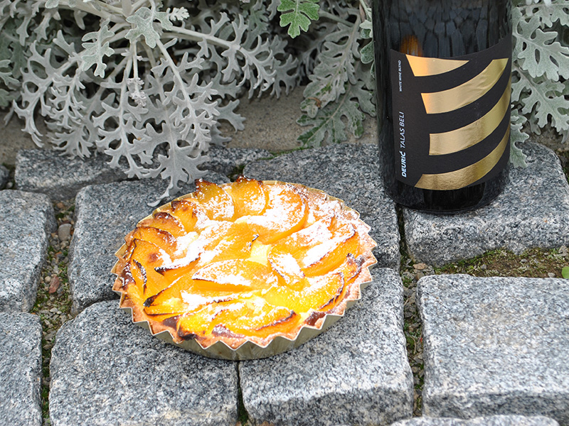 Naravno, za kraj mi je trebala i neka poslastica. Tu sam se odlučio za tart od bresaka. Pošto nije bilo svežih, koristio sam kompot od bresaka ubranih baš na Fruškoj gori gde se nalazi i vinarija Deurić. Ovom ukusnom tartu Talas beli će biti savršen par.