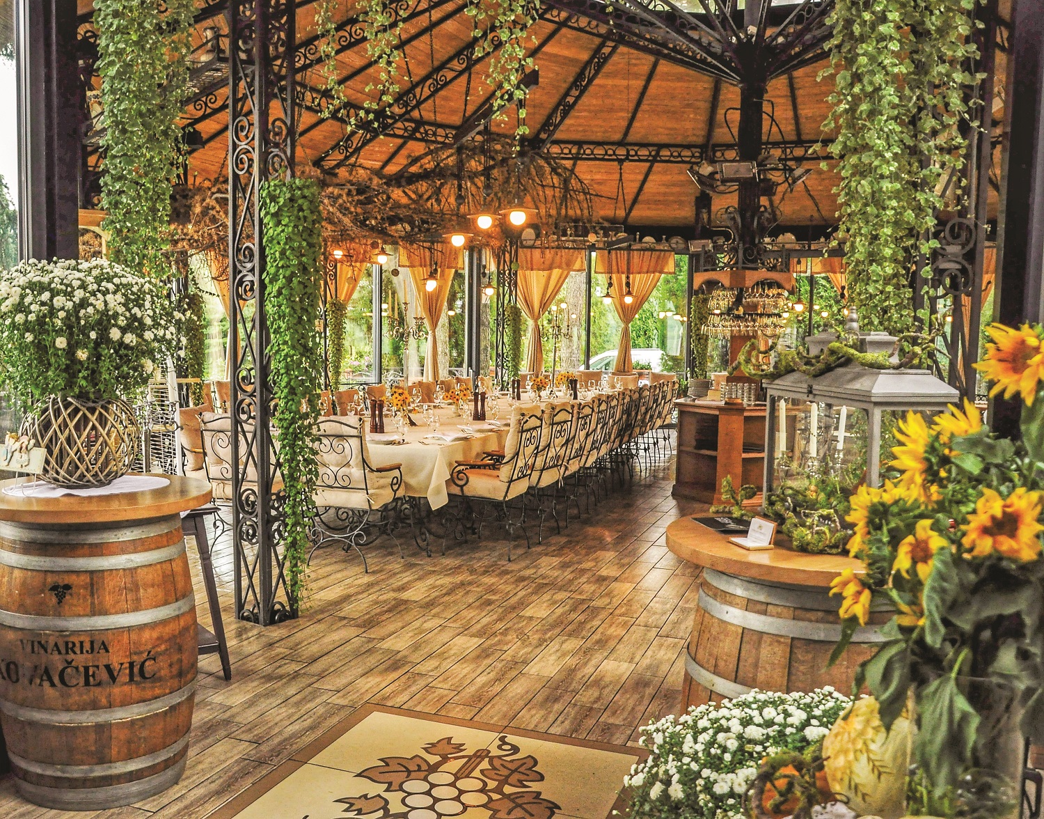 Objekat krasi velika bašta iz koje pogled puca na pitome fruškogorske brežuljke. U restoranu radi profesionalno i dobro obučeno osoblje, a jelovnik se temelji kako na modernoj evropskoj, tako i na tradicionalnoj kuhinji. Izvanredna prezentacija, ozbiljna restoranska postavka, te lični pečat šefova kuhinje i vrhunske namirnice iz okoline krase svaki tanjir. Ovde se, naprosto, zaista dobro jede. Među favoritima naći ćete i jela sa lokalnim tartufima, komade mesa koji se tope u ustima, divljač i nešto jela od ribe. U Vinskoj kući za posetioce organizuju se posebni ručkovi i večere sa uparivanjem vina, kao i kratke i duže degustacije uz birane zalogaje. Takođe, organizuju se i ture sa obilaskom proizvodnje i podruma vinarije. Za zahtevnije posetioce u ponudi su i vina iz specijalnih, ograničenih serija, koje nije moguće pronaći u slobodnoj prodaji, kao i arhivska vina iz starih berbi.U okviru Vinske kuće, na samom ulazu, nalazi se i vinoteka u kojoj je moguće kupiti sva vina iz ponude vinarije Kovačević. Paleta vina ove vinarije veoma je široka, ali gotovo da je nemoguće da pogrešite u izboru. Posebno se izdvajaju njihova oranž vina, naročito sovinjon, kao i Aurelius iz specijalne S edicije. Iznenadiće vas i arhivska vina, pogotovo rizlinzi i šardonei, a ako biste da uživate bez opterećenja, Kovačevićev čuveni sveži šardone ili razigrani Rosetto nameću se kao logičan izbor.