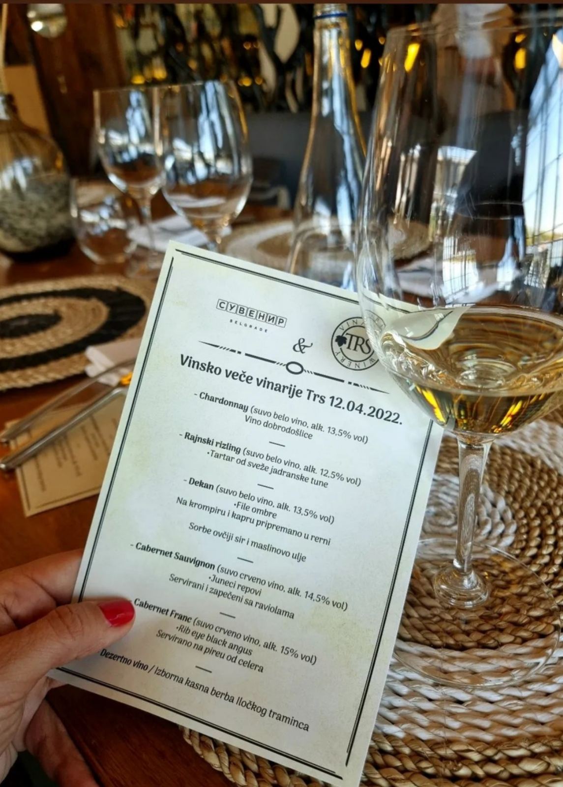 U restoranu Suvenir u Beogradu, na savskoj obali novobeogradskih blokova, nedavno je održana vinska večera na kojoj je glavna zvezda, uz kuvanje šefa Vasa Milenića, bila iločka vinarija Trs, sa sledom vina od međunarodnih i regionalnih sorti koja su izvanredno pratila meni od više zanimljivih sledova.